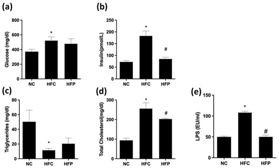 The effects of a high-fat diet and LP1008 treatment on the following serum biochemical parameters: (a) glucose, (b) insulin, (c) triglycerides, (d) total cholesterol, and (e) LPS in male mice. The data are expressed as the means ± SDs. * p < 0.05 compared with the NC group; # p < 0.05 compared with the HFC group. NC: normal control; HFC: high-fat control; HFP: high-fat diet + LP1008.