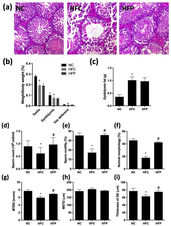 The effects of a high-fat diet and LP1008 treatment on (a) testicular histology; (b) relative weights of the testes, epididymis, and vas deferens; (c) epididymal fat; (d) sperm count; (e) sperm motility; (f) percentage of sperm with a normal morphology; (g) mean testicular biopsy score (MTBS); (h) mean seminiferous tubule diameter (MSTD); and (i) thickness of the germinal epithelium (GE) in male mice. Testicular sections were stained with hematoxylin and eosin. The data are expressed as the means ± SDs. * p < 0.05 compared with the NC group; # p < 0.05 compared with the HFC group. NC: normal control; HFC: high-fat control; HFP: high-fat diet + LP1008.