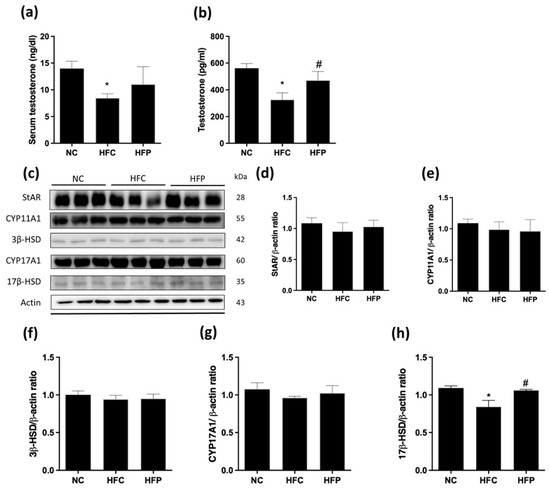 The effects of a high-fat diet and LP1008 treatment on the following testosterone biosynthesis regulators in male mice: (a) serum testosterone, (b) testicular testosterone, (c) protein expression in each group (Figure S1), (d) StAR, (e) CYP11A1, (f) 3β-HSD, (g) CYP17A1, and (h) 17β-HSD. Relative density analysis of protein bands in male mice. The data are expressed as the means ± SDs. * p < 0.05 compared with the NC group; # p < 0.05 compared with the HFC group. NC: normal control; HFC: high-fat control; HFP: high-fat diet + LP1008.