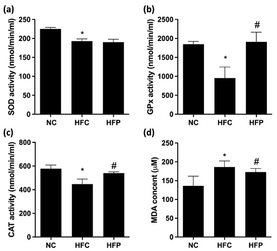 The effects of a high-fat diet and LP1008 treatment on (a) SOD activity, (b) GPx activity, (c) CAT activity, and (d) MDA content in male mice. The data are expressed as the means ± SDs. * p < 0.05 compared with the NC group; # p < 0.05 compared with the HFC group. NC: normal control; HFC: high-fat control; HFP: high-fat diet + LP1008.