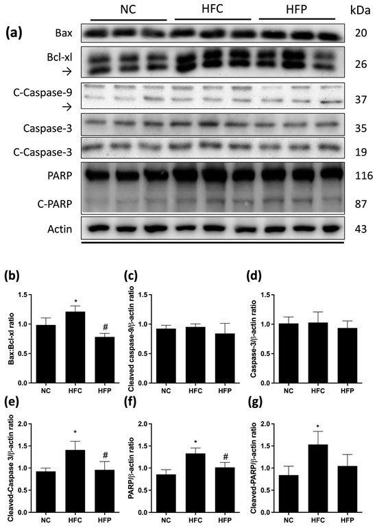 The effects of a high-fat diet and LP1008 treatment on testicular intrinsic apoptosis pathway regulators: (a) protein expression in each group (Figure S3), (b) Bax/Bcl-xl ratio, (c) cleaved caspase-9, (d) caspase-3, (e) cleaved caspase-3, (f) PARP, and (g) cleaved PARP in male mice. The data are expressed as the means ± SDs. * p < 0.05 compared with the NC group; # p < 0.05 compared with the HFC group. NC: normal control; HFC: high-fat control; HFP: high-fat diet + LP1008.