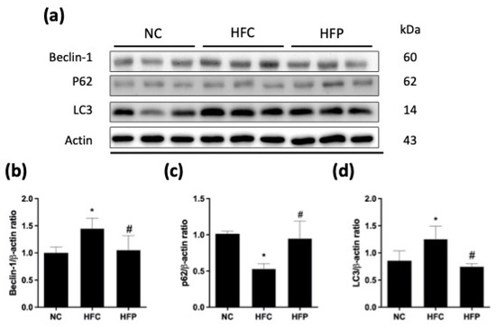 The effects of a high-fat diet and LP1008 treatment on testicular autophagy pathway regulators: (a) protein expression in each group (Figure S4), (b) beclin-1, (c) p62, and (d) LC3 in male mice. The data are expressed as the means ± SDs. * p < 0.05 compared with the NC group; # p < 0.05 compared with the HFC group. NC: normal control; HFC: high-fat control; HFP: high-fat diet + LP1008.