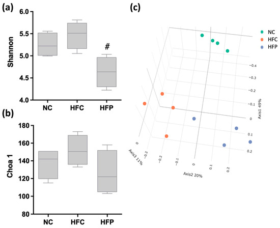 The effects of a high-fat diet and LP1008 treatment on the gut microbiota: (a,b) community diversity and richness assessed by the Shannon and Chao indices, (c) principal coordinate analysis (PCoA) score plot in male mice. # p < 0.05 compared with the HFC group. NC: normal control; HFC: high-fat control; HFP: high-fat diet + LP1008.