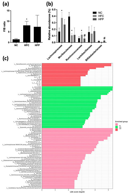 The effects of a high-fat diet and LP1008 treatment on the gut composition: (a) Firmicutes/Bacteroidetes (F/B) ratio, (b) abundances of the gut microbiota at the family level, and (c) linear discriminant analysis (LDA > 2) scores derived from LEfSe analysis in male mice. * p < 0.05 compared with the NC group; # p < 0.05 compared with the HFC group. NC: normal control; HFC: high-fat control; HFP: high-fat diet + LP1008.