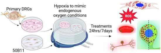 Primary cultures of DRGs were prepared and treated for 24 h or 7 days in hypoxia (hypoxia to mimic endogenous conditions and prevent levodopa auto-oxidation). Cultures were then examined for mitochondrial membrane potential (tetramethylrhodamine, methyl ester (TMRM)), reactive oxygen species (ROS) using dihydroethidium, beta III tubulin and lysosome content using Lysotracker red (red dots in the green DRG soma) and lysosome acidity (Lysotracker red + Lysosensor green, red + green = yellow dots in green DRG soma) as detailed in the text. Cells from the 50B11 cell line were also treated, then cultured in hypoxia for 24 h, and lysosome content was examined, as detailed in the text, using Lysotracker (red dots in the cell soma at top right). Figure made using BioRender.
