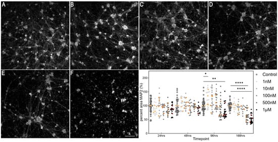 Time-dependent cytotoxicity of rotenone in DRGs. Cells were fixed and stained for MAP2, a pan-neuronal marker. (A–F) Example photomicrographs following 7 days (168 h) of treatment; (A) = control, (B) = 1 nM, (C) = 10 nM, (D) = 100 nM, (E) = 500 nM, (F) = 1 µM. Scale bar in (F) = 200 µm and is for all photomicrographs. Photomicrographs are not edited except for contrast, and they depict the MAP2 channel. The graph shows the time-dependent effect of rotenone on DRGs. Symbols in white and shades of grey to black show data from individual technical replicates. Symbols in shades of orange to brown show experimental means. * p < 0.05, ** p < 0.01, **** p < 0.0001.