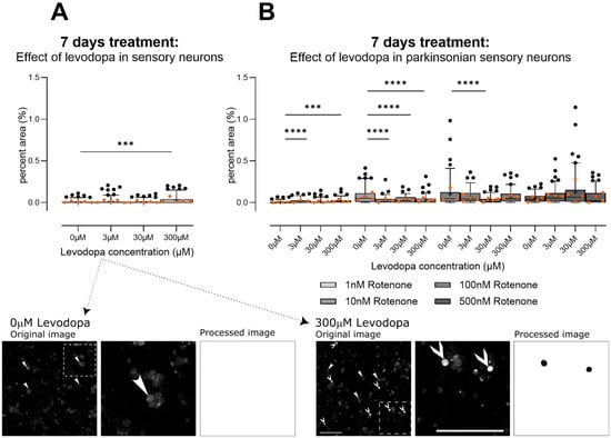 Effect of levodopa on oxidative stress in primary sensory neurons (DRGs) cultured in hypoxia. (A) Alone, only the highest concentration of levodopa (300 µM) induces mild oxidative stress. (B) In the context of parkinsonism (rotenone), levodopa increases oxidative stress at 1 nM rotenone. At moderate mitochondrial inhibition (10 nM, 100 nM), levodopa tended to reduce oxidative stress, possibly due to its ability to accept electrons [33] and this effect is lost at 500 nM rotenone. Data are technical replicates and are shown as box plots with whiskers depicting 5–95% percentiles, black circles depicting remaining data points, lines depicting medians and “+” symbols depicting means. Light and dark orange circles show means for each experiment. *** p < 0.001, **** p < 0.0001 post hoc tests, following ANOVA, as discussed in text. Photomicrograph for 0 µM levodopa shows example original image of cells treated with 0 µM levodopa for 7 days and stained using dihydroethidium, with outlined area shown zoomed in and its corresponding segmentation; no cells were positive for oxidative stress. Photomicrograph for 300 µM levodopa shows example original image of cells treated with 300 µM levodopa for 7 days, then stained with dihydroethidium, with outlined area shown zoomed in and its corresponding segmentation; two cells were positive for oxidative stress in the zoomed in area. Arrowheads in photomicrographs point to DRG soma negative for oxidative stress (e.g., 0 µM levodopa). Arrows in photomicrographs point to DRG soma positive for oxidative stress. Photomicrographs are not modified, except for cropping for the zoomed images. Image processing picked out only DRG soma that contained reactive oxygen species. Note that the segmentation was for the entire image; here, we have used zoomed in areas to better demonstrate the segmentation. Scale bars = 200 µm.