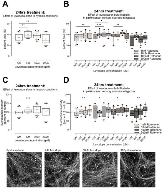Effect of levodopa on beta III tubulin in primary sensory neurons (DRGs) cultured in hypoxia. (A) Alone, 3µM and 30 µM levodopa increased percent area immunoreactive for beta III tubulin. (B) In the context of parkinsonian sensory neurons (treated with rotenone), levodopa tended to increase percent area positive for beta III tubulin at 30 µM and 300 µM. (C) We examined fluorescence intensity for beta III tubulin, at the level of individual neurites in cells. Cells treated with levodopa only again showed increased fluorescence at 30 µM. (D) In the context of parkinsonian sensory neurons (treated with rotenone), 30 µM and 300 µM levodopa tended to increase fluorescence for beta III tubulin. Data are technical replicates shown as box plots with whiskers depicting 5–95% percentiles, black circles depicting remaining data points, lines depicting medians and “+” symbols depicting means. Light orange circles depict experimental means. * p < 0.05, ** p < 0.01, *** p < 0.001 post hoc tests, following ANOVA, as discussed in text. Photomicrographs show example original images of cells treated for 24 h in hypoxia with 0 µM, 3 µM, 30 µM, 300 µM levodopa, only, then stained for beta III tubulin. Photomicrographs are not modified. Scale bar bottom right = 200 µm, for all images.