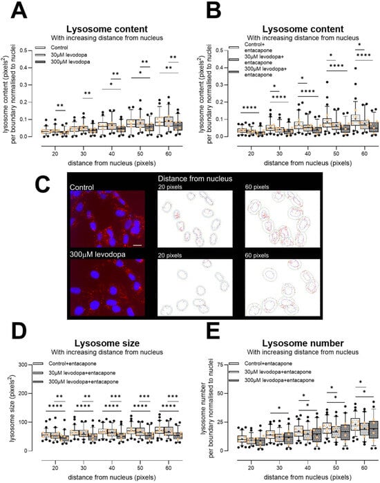 These analyses are on the basis of individual lysosome size, and had a very large N, which may have contributed to the very robust statistical differences that we observed. We then moved to a separate and more conservative per-cell-based analysis by examining lysosome content at increasing distances from nuclei. As shown in Figure 7, we indeed observed a large reduction in total lysosome content at 300 µM levodopa irrespective of entacapone (Figure 7A, effect of levodopa F (2, 146) = 5.8, p < 0.01, distance × treatment F (8, 584) = 5.2, p < 0.0001; Figure 7B, effect of levodopa, F (2, 179) = 13.08, p < 0.0001, distance × treatment F (8, 716) = 11.8, p < 0.0001). Critically, the addition of entacapone to protect levodopa resulted in a reduction in lysosome content caused by 30 µM levodopa (Figure 7B). We also analysed these data using linear regression, and indeed, in the context of entacapone, the slope of increase in lysosome content within increasing distance from nucleus was reduced by both 30 µM levodopa (F (1, 621) = 6.1, p < 0.02) and 300 µM levodopa (F (1, 636) = 15.4, p < 0.0001).