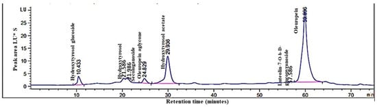 Phenolic compounds in olive leaf extract analysis using high-performance liquid chromatography (HPLC) (Figure 2) successfully identified seven distinct compounds: hydroxytyrosol glucoside (retention time: 10.433 min), hydroxytyrosol (21.586 min), secologanoside (21.986 min), oleuropein aglycone (24.829 min), hydroxytyrosol acetate (29.936 min), luteolin-O-β-d-glucopyranoside (57.586 min), and oleuropein (59.896 min).