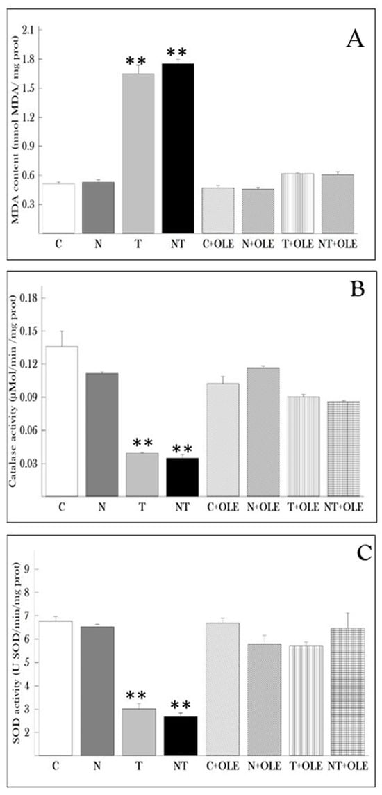 Lipid peroxidation levels were evaluated according to the protocol established by Buege and Aust [33]. The samples were treated with a butylated hydroxytoluene/trichloroacetic acid (BHT–TCA) solution at varying concentrations ranging from 1 to 20% (v/v) and then centrifuged at 850× g for 10 min. The resulting supernatant was combined with a tertiary butyl alcohol (TBA)–Tris solution (120 mM–26 mM, v/v) under acidic conditions (0.6 M HCl). The mixture was heated at 100 °C for 15 min and cooled to room temperature. Absorbance was measured at 532 nm using a UV-spectrophotometer (Labomed, UV-2650, Inc., Los Angeles, CA, USA), and the results were quantified as nmol of MDA/mg of protein.