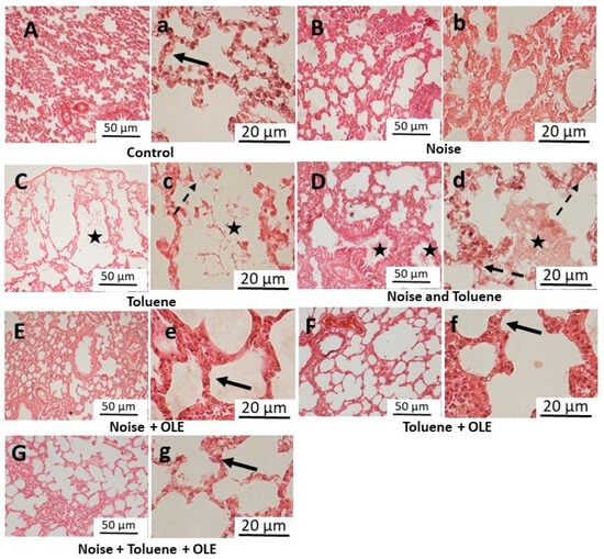 In conclusion, the present study’s findings indicate that exposure to toluene, either alone or in combination with noise, significantly induces oxidative stress, inflammation, and histopathological alterations in the lungs. In contrast, noise exposure alone did not significantly change these parameters. Nevertheless, noise exposure increased the levels of pro-inflammatory cytokines, highlighting its role in immune response modulation. Notably, the administration of Olea europaea leaf extract demonstrated a protective effect, mitigating the adverse effects of toluene and noise. This study underscores the potential of natural compounds as protective agents against occupational hazards, suggesting their incorporation into health and safety protocols.