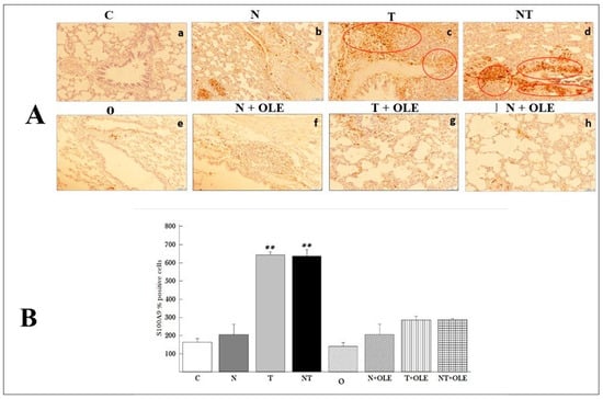 Lung tissues were initially fixed in 10% neutral-buffered formalin, embedded in paraffin, and sectioned at a thickness of 5 μm. The paraffin-embedded sections underwent dewaxing through two sequential immersions in toluene for 5 min each and rehydrated using graded ethanol concentrations (100%, 90%, and 70%) for two cycles of 3 min. The sections were then immersed in distilled water for 5 min, treated with a citric buffer solution (0.01 M, pH 6) under microwave irradiation at 300 W for 20 min, cooled at room temperature, and rinsed three times with Tris-buffered saline (TBS, 50 mM, pH 7.6) for 5 min each. To detect the S100A9 antibody, the Novolink Polymer Detection System (Leica Biosystems, Newcastle upon Tyne, UK) was applied following the manufacturer’s guidelines. The sections were incubated with 3,3′-diaminobenzidine (DAB) solution for 30 s, followed by a rapid rinse in TBST solution, immersion in hematoxylin, water rinsing, and eosin staining. Dehydration was achieved using two 5-min baths each in 95% and 100% ethanol, followed by three consecutive toluene baths for 5 min each. Negative controls were incorporated by substituting the primary antibody with nonimmune immunoglobulins. The prepared sections were analyzed using a DM 1000 Leica photomicroscope (Leica Microsystems, Milton Keynes, UK), and macrophage cell counts were conducted in 100 fields per group. The results were reported as the number of labeled cells per mm2.