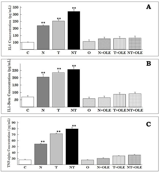 Our study, summarized in Figure 8, hypothesizes that exposure to noise and toluene polarizes macrophages towards a pro-inflammatory type 1 subtype, thereby potentially increasing IL-1β, TNF-α, and IL-6 production via activation of the NF-κB signaling pathway. The administration of Olea europaea leaf extract is a promising strategy to alleviate the inflammation induced by toluene and noise exposure.