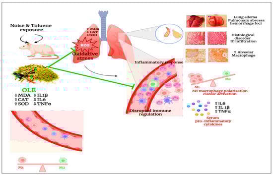 Chronic exposure to noise and toluene harms the body, particularly the lungs, by inducing oxidative stress. This stress leads to an increased level of MDA, which disrupts the activities of catalase and SOD. Additionally, it causes disarray in the architecture of the pulmonary tissues. Co-exposure to noise and toluene increases pulmonary macrophage levels with classical activation, thus triggering an inflammatory response characterized by elevated levels of pro-inflammatory mediators such as TNF-α, IL-6, and IL-1β. This response results in vasodilation and increased vascular permeability, thereby promoting the infiltration of immune cells into pulmonary tissues. However, the administration of OLE reduced oxidative stress by decreasing MDA levels and enhancing antioxidant capacity. Concurrently, it also reduces the number of pulmonary macrophages, leading to a decrease in pro-inflammatory mediators and modulation of the inflammatory response. Moreover, OLE improves the architecture of pulmonary tissues.