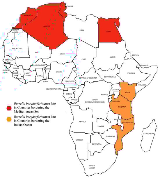 In Africa, ticks transmit several pathogens, including Borreliae, which most often belong to the Relapsing Fever Group (RFG), where the vector is often a soft tick, usually of the genus Ornithodoros spp. or similar. The RFG Borreliae are transmitted vertically into the ticks, which can act as a reservoirs (O. moubata) and contribute to the maintenance and spread of the infection []. In LG Borreliae, the vertical transmission is negligible, and ticks should be infected by a reservoir host (rodents or lizards) to transmit LB []. RFG Borreliae can also be transmitted by hard ticks (Hard-Tick-Borne Relapsing Fever—HTBRF). Both Borrelia miyamotoi and Borrelia theileri are present in Africa [].