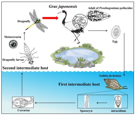 Species of the family Prosthogonimidae are considered the most pathogenic poultry trematodes worldwide, affecting particularly free-range poultry and wild birds. They have been reported in many regions worldwide, including Asia, Europe, Africa, and America [1,2,3,4,5]. The Prosthogonimus species that have been reported in China include Prosthogonimus ovatus (Rudolphi, 1803), Prosthogonimus cuneatus (Rudolphi, 1809) and Prosthogonimus pellucidus (von Linstow, 1873) [1,6]. P. pelucidus is a common Prosthogonimus species and is distributed in the south, east, northeast, and western regions of China. The life cycle of Prosthogonimus spp. is shown in Figure 1. Qiu and Liu (1983) identified Gabbia fuchsiana (Möllendorf, 1888) as the first intermediate host of P. pellucidus in China [6]. The snail takes up the trematode eggs deposited in the water and the miracidium that hatched in the intestine of the snail migrates into the hepatopancreas. Here, sporocysts are produced and cercariae are released into the water. Final hosts become infected by dragonflies or damselflies (Odonata), which contain metacercariae of Prosthogonimus spp. Adults of Prosthogonimus species mainly parasitize in the cloaca, oviduct, and bursa Fabricii of poultry, and excrete eggs in the host’s feces [7]. Poultry infected with Prosthogonimus species show inflammation of the oviduct and bursa of Fabricius, and may lay eggs with soft shells or without any shell at all [5]. In addition, Prosthogonimus species may rarely also infect mammals, where they reside in the body cavity, intestine, or liver, and lead to peritonitis [8,9]. It has been reported that a nine-month-old infant was infected by Prosthogonimus sp. in Indonesia [10].