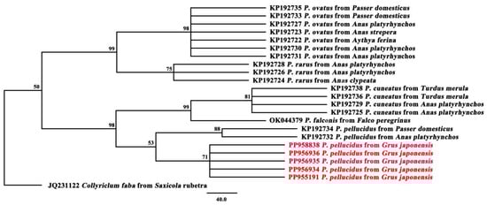 In addition to our P. pellucidus data, the 17-member phylogenetic dataset contains the following: P. ovatus (KP192735) from Passer domesticus (Poland); P. ovatus (KP192733) from P. domesticus (Poland); P. ovatus (KP192727) from Anas platyrhynchos (Czech Republic); P. ovatus (KP192723) from Anas strepera (Czech Republic); P. ovatus (KP192722) from Aythya ferina (Czech Republic); P. ovatus (KP192730) from A. platyrhynchos (Czech Republic); P. ovatus (KP192731) from A. platyrhynchos (Czech Republic); P. rarus (KP192728) from A. platyrhynchos (Czech Republic); P. rarus (KP192726) from A. platyrhynchos (Czech Republic); P. rarus (KP192724) from Anas clypeata (Czech Republic); P. cuneatus (KP192738) from Turdus merula (Czech Republic); P. cuneatus (KP192736) from T. merula (Czech Republic); P. cuneatus (KP192729) from A. platyrhynchos (Czech Republic); P. cuneatus (KP192725) from A. platyrhynchos (Czech Republic); Prosthogonimus falconis (OK044379) from Falco peregrinus (The United Arab Emirates); P. pellucidus (KP192734) from P. domesticus (Poland); P. pellucidus (KP192732) from A. platyrhynchos (Czech Republic). And Collyriclum faba (JQ231122) from Saxicola rubetra was included as an outgroup. Phylogenetic trees were all reconstructed using maximum parsimony (MP) methods. MP methods were performed using the Fitch criterion within PAUP v. 4.0 Beta 10 [20], and bootstrap support values were calculated in PAUP from 1000 bootstrap replicates with 10 random additions per replicate. Phylograms were viewed and drawn using FigTree V. 1.42 [21].