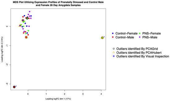 After filtering for genes with no gene expression across all samples, 24,574 genes remained for further testing. A multidimensional scaling plot (MDS) was constructed utilizing the normalized gene counts of the 32 samples (Figure 1). There was a lack of clustering between the groups (treatment or sex) and the dispersion estimate was 0.07. In the PCA plot (Figure 1), two samples stood out visually as outliers: a control male and a PNS female. The control male had significantly fewer reads produced (36.5 million), but the PNS female showed no major differences in mapping quality or statistics. The rPCA analysis resulted in the designation of those samples and three additional samples (PNS female and control male and control female) as outliers. The cutoff values for outlier detection were 1.414095 × 10−8 for orthogonal distance and 7.034 for scored distance. These samples fell outside the calculated values (Supplementary Table S1), indicating they were significantly different from other samples in their treatment groups in terms of overall gene expression profiles [28]. The PCAHubert approach identified the control male with reduced reads and then three additional samples (two control females and one control male). The cutoff values for outlier detection were 9074.45 for orthogonal distance and 2.241 for scored distance. These samples fell outside the calculated values (Supplementary Table S1). Figure 1 presents an MDS plot with the identified samples from all methods.