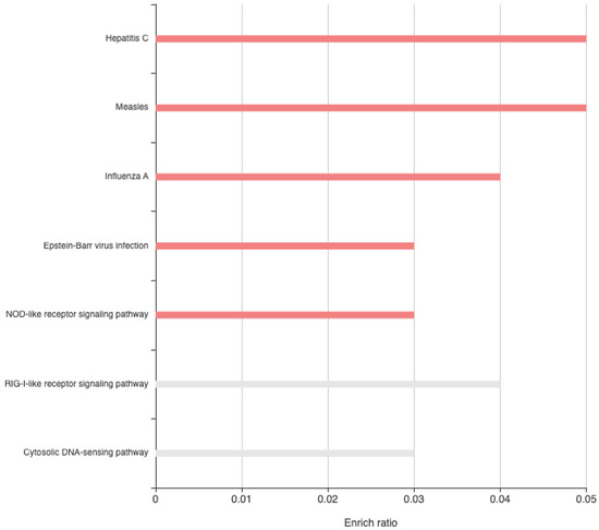 When disregarding treatment, 58 genes were differentially expressed between males and females (Supplementary Table S2). The majority (n = 45) showed increased expression in females compared to males. The LIM homeobox 1 gene had increased expression in males relative to females, a pattern that was observed within the pig amygdala [49]. General differences in gene expression within the amygdala between males and females have been observed in genes related to the circadian clock and energy metabolism in mice and in humans [50]. However, gene enrichment analysis revealed that many of the differently expressed genes are involved in infectious disease (viral) KEGG pathways, including Hepatitis C and Influenza A (Supplementary Table S3, Figure 3). The central amygdala modulates neuroendocrine, febrile, and behavioral responses to HSV-1 infection, as infected rats showed reduced HPA axis activation, fever, motor hyperactivity, and aggressive behavior [17]. Additionally, the amygdala demonstrates neuronal activity changes, measured by intracerebral electroencephalography and c-fos abundance, in response to lipopolysaccharide challenges [51]. Most studies characterizing the immune response in cattle focus on blood samples. Consequently, the potential role of the amygdala in beef cattle immune response remains unknown. However, sex differences in immune responses have been observed. Notably, beef cattle exhibited sex differences in response to viral, bacterial, and lipopolysaccharide challenges [52,53]. The current project identified sexually dimorphic expression of amygdala genes in calves at 25 days of age. Sexually dimorphic responses of older beef cattle to stress have been reported. Heifers and bulls at 8–9 months of age differed in response to provocative systemic lipopolysaccharide challenge [53]. Specifically, the LPS-induced increase in heart rate was greater in heifers than bulls whereas sickness scores were less in heifers than bull calves. In addition, heifers exhibited a greater febrile response, an enhanced tumor necrosis alpha (TNF-α) response, and neutrophilia, while bulls had more leukocytes and a greater IFN-γ response. Sexual dimorphic responses to prenatal stress have been reported in goats and pigs [54,55]. For example, 10-week-old female but not male pigs whose mothers were exposed to a social stressor during gestation had increased anxiety-like behavior as adolescents and as mothers [55].