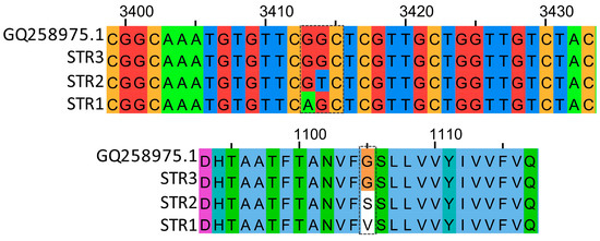 Alignment of GQ258975.1, STR1, STR2 and STR3 isolates for CesA3 partial sequences.
