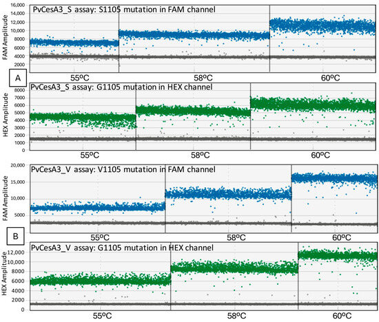 When testing specificity, a low-amplitude cluster was found in the HEX channel. In the case of PvCesA3_S assay (Figure 4A), the low amplitude cluster was caused by the HEX probe attaching to the V1105 mutation. In the case of PvCesA3_V assay (Figure 4B), the low amplitude cluster was caused by the HEX probe attaching to S1105 mutation. In either case, the clusters were clearly separated, so it was acceptable to threshold these clusters as negative for the mutant of interest, as shown in Figure 4. Nevertheless, to avoid thresholding problems in complex population samples from field, a multiplex assay was developed.