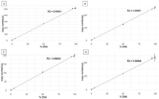 The sensitivity and accuracy of the assays were evaluated by their capability to discriminate between the alleles in mixed samples in vitro. For this purpose, equal concentrations (5 ng/µL) of DNA from resistant and sensitive isolates were mixed using the ratios reported in Table 3. Statistical analysis was conducted using RStudio v.4.2.2, where the linear correlation between copy numbers measured in ddPCR and corresponding percentages of the mixes were assessed.