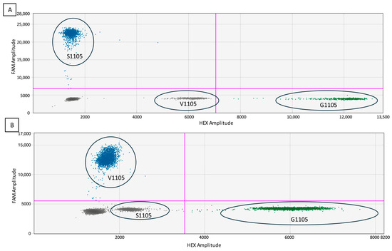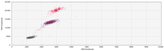 Multiplexing in ddPCR refers to multiple target sequence detection and quantification. In probe-based ddPCR, probes can only be labeled with two different fluorescent dyes (FAM and VIC/HEX), so multiplexing can be achieved by generating fluorescence signals of varying amplitude using the difference in probe concentration and amplification efficiency (Hou et al., 2023) [30]. Therefore, multiplex assays were carried out combining all three probes in the same PCR reaction mix. The same probes and reagents described in Section 2.5 were used. Final concentrations of each component in all multiplex reactions were as follows: 1× Bio-Rad ddPCR™ supermix for probes (no dUTP, 2× concentrated), 1× G1105 ddPCR assay primers–probe mix (20× concentrated, ready-to-use), 1× V1105 ddPCR assay primers–probe mix (20× concentrated, ready-to-use), 0.5× S1105 ddPCR assay primers–probe mix (20× concentrated, ready-to-use), double-distilled water and 5 ng of target DNA. All multiplex reactions were carried out in the selected optimum ddPCR conditions.