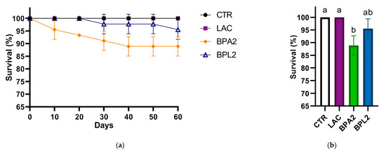 (a) Survival dynamics of Danio rerio individuals for 60 days and (b) on day 60 of the experiment to study the survival of individuals when exposed to bisphenol A in the presence/absence of probiotic. CTR—control group, LAC—group received L. brevis 47f with feed and were in a toxicant-free solution, BPA2—group received basic feed and were in a bisphenol A solution at a concentration of 2 mg/L, BPL2—group received L. brevis 47f under consideration with feed and were in a bisphenol A solution at a concentration of 2 mg/L. According to Kruskal–Wallis test, p-value < 0.05. Letters above the columns represent the static significance between the different experimental groups.