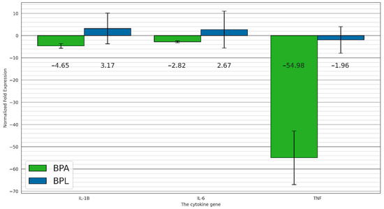 The following experimental groups of individuals were compared: BPL—a group in bisphenol A solution and fed a probiotic, BPA—a group also in bisphenol A solution but fed without additives. Bisphenol A exposure in Danio rerio intestinal tissues significantly reduced the expression of the pro-inflammatory cytokine genes il-1b, il-6, and cytokine gene tnf-α by 4.65-, 2.82-, and 54.98-fold, respectively. Addition of Levilactobacillus brevis 47f strain to the feed of Danio rerio still in bisphenol A solution increases the expression of cytokine genes il-6 and il-1b by 2.67-, and 3.17-fold, respectively, and decreases the expression of tnf-α by 1.96-fold. Levilactobacillus brevis 47f strain reduces the effect of bisphenol A on tnf-α cytokine gene expression by 28-fold (Figure 2).