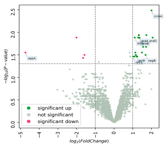 Noteworthy is the increase in the expression of araA, araB, and araD genes located in the same operon and involved in arabinose metabolism. There is also a change in the expression of genes of various transport proteins, genes involved in the synthesis of fatty acids, and genes of transcriptional regulators, in addition to the oppA gene encoding a protein responsible for the attachment of bacterial cells to the surfaces of mucous membranes [40]. According to literature data, this gene is also capable of influencing stress resistance [41].
