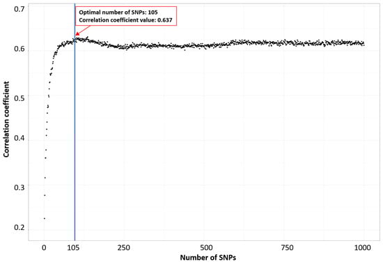 Secondly, we utilized the incremental feature selection (IFS) technique, which prioritized SNPs based on their rankings in an RF model. This approach was used to identify the optimal number of features (SNPs) associated with a particular phenotype, as shown in Figure 1 for milk yield at 210 days, following the methodology suggested in [,,,]. During the application of IFS, SNPs were progressively added in descending order of their ranks within the feature set. Subsequently, an RF classifier was built, and its predictive performance was assessed based on the correlation coefficient. Supplementary Figures S1 and S2 provide an extended view of Figure 1 with 3000 and 5000 SNPs, enabling a comparative analysis of the impact of different SNP numbers.