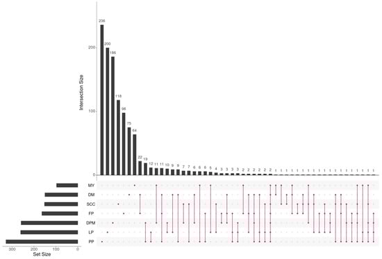 - Conway, J.R.; Lex, A.; Gehlenborg, N. UpSetR: An R package for the visualization of intersecting sets and their properties. Bioinformatics 2017, 33, 2938–2940. [Google Scholar] [CrossRef]