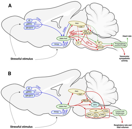 The functional distinction between these parabrachial subdivisions has been confirmed through neuropharmacological studies. For example, using muscimol to inhibit lPB neurons suppresses the tachypnea induced by DMH/PeF activation, indicating that the lPB is directly involved in mediating the respiratory effects of DMH/PeF activity [67]. Similarly, activation of the lPB has been found to exert an efficient control over cardiovascular responses by influencing neurons in the RVLM that project to the sympathetic nervous system. This indicates that the lPB serves as a key relay point, translating DMH/PeF signals into both respiratory and cardiovascular adjustments. Importantly, the involvement of glutamate, acting on ionotropic receptors within the PBc, underscores its role in mediating the effects of DMH/PeF, contributing to the rapid autonomic adjustments during stress [63,67,68].