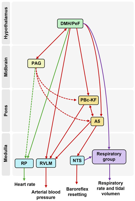 Beyond fast autonomic responses, the DMH/PeF also plays a crucial role in the re-adjustment of reflexes that regulate blood pressure. For example, during stress, it facilitates the adjustment of the baroreceptor reflex to accommodate elevated blood pressure levels, a necessary adaptation for the body’s defense response [23]. Additionally, the DMH/PeF is involved in enhancing the chemoreflex [24,25], further demonstrating its multifaceted role in cardiorespiratory control.