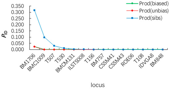 Individual genotypic similarity probability curves of 14 microsatellite loci order. Note: Prod(unbias): This term refers to the “parental unbiased” genotype reconstruction method. Prod(sibs): This term refers to the “siblings-based” genotype reconstruction method.