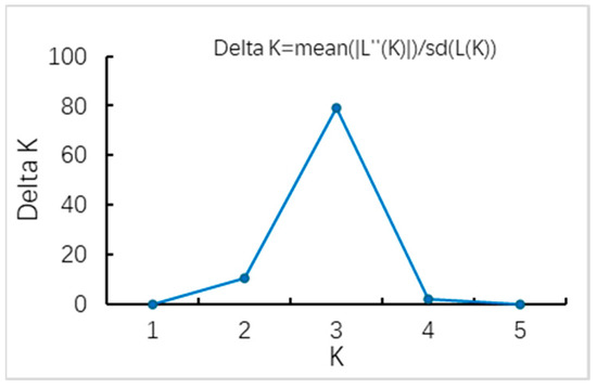 Bayesian clustering shows that when K = 3, the mean value of LnPr(X|K) reaches the maximum, and the fluctuation range between repeated experiments is small, which indicates that the stability of the model is enhanced under the assumption of K = 3 [17,22]. The genetic grouping of 244 individuals showed significant diversity. It is worth noting that there is obvious genetic differentiation between the SH population and other populations, while genetic exchanges between other populations are more frequent and the genetic similarity is higher. In particular, the genetic similarity between the SL and HZ populations is extremely significant, which indicates that there is a close genetic connection between the two populations, which plays a key role in maintaining the genetic diversity and adaptability of the overall population (Figure 3 and Figure 4).