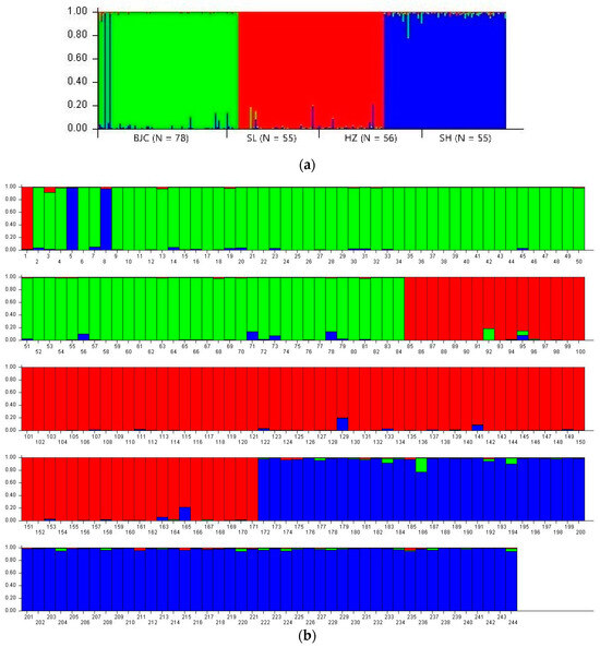 Bayesian genetic clustering analysis of the microsatellite data (K = 3). Note: Each colored vertical bar represents an individual. The proportion of vertical bars with different colors illustrates the probability that individuals are assigned to various groups. (a) The letters at the bottom indicate the sample collection place. (b) The numbers indicate the number of individuals. BJC: 1–78, SL: 79–133, HZ: 134–189, SH: 190–244.