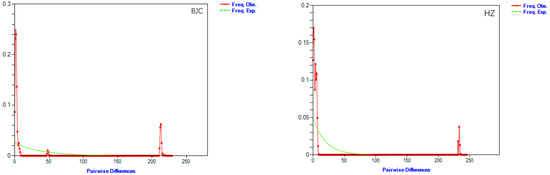 The detection results of population bottleneck effects based on the microsatellite data show that the Siberian roe deer population in the Greater Khingan Mountains has not experienced a recent bottleneck effect. In the TPM model, four populations showed significant heterozygosity deficiency (p < 0.01), suggesting that these populations did not suffer from recent bottlenecks. In both the SMM and TPM models [22], the heterozygosity excess index results showed no significant difference (p > 0.05), and the allele frequency distribution did not deviate significantly from the typical “L”-shaped distribution. There is no evidence of near-term bottleneck effects in other populations. In the SMM model, the detection results of insufficient heterozygosity in the four populations were extremely significant (p < 0.01), which was consistent with previous research results (Table 8). Taking into account the results of the mitochondrial DNA neutrality test, the Wilcoxon test of the microsatellite data, as well as the SMM (stepwise mutation model) and TPM (two-phase model), it can be inferred that the Siberian roe deer population has not experienced recent expansion events in the evolutionary process [22].