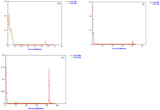 We used T (Myr) to estimate the population expansion time, where T = π/2 (ut) [61]. It can be inferred from the dispersal time that populations in the four areas experienced dispersion during the Quaternary Pleistocene; at the same time, the BJC population and the Pine Ridge population experienced dispersion during the last glacial period of the Quaternary. Combining the mismatch distribution map and the neutrality test results, it can be seen from the population diffusion time that the HZ (T = 0.121358 Myr) and SH (T = 0.109400 Myr) populations have the earliest diffusion times, followed by the BJC (T = 0.062921 Myr) and SL (T = 0.041852 Myr) populations. By estimating the expansion times of the populations, we found that the HZ and SH populations had relatively long dispersal times, while the BJC and SL populations mainly experienced the dispersal process of the Quaternary Pleistocene and the Last Glacial Age. A mismatch distribution map was constructed based on the observed and expected frequencies of base pairs between Cyt b gene haplotypes, showing that the population did not expand (Table 7, Figure 5). The HZ and SH populations showed significant negative values (p < 0.05), while the SL population showed extremely significant negative values (p < 0.01); the Tajima’s D of the overall population was −2.06599, showing a borderline significant negative value (p = 0.04875 < 0.05). Calculating the Cyt b gene Fu’s Fs value, BJC, SL, and HZ were all positive, while SH showed an insignificant negative value (p > 0.1). A combination of mismatch distribution analysis and neutrality testing showed that no recent historical expansion events occurred in the four populations.