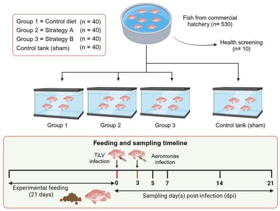 Experimental design of the study. The fish were fed a control diet only or feed supplemented with additives using strategy A or B for 21 days. Groups 1 to 3 had four replicates and one tank dedicated as the control tank (sham) group. Fish were injected intraperitoneally with TiLV at 105 TCID50/mL on day 0 and A. hydrophila at 108 CFU/mL on day 3.