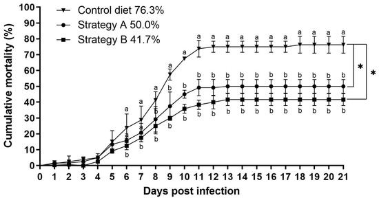 Comparison of the cumulative mortality (%) of red hybrid tilapia coinfected with Tilapia lake virus (TiLV) and Aeromonas hydrophila from the control group and the groups that received feed additives with strategy A or B. The asterisks (*) indicate significant differences in cumulative mortality (p < 0.05) compared to the control group.