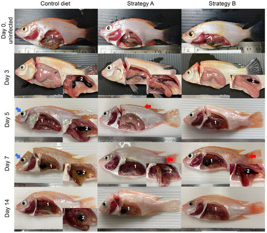 The external appearances and lesions of internal organs (1-liver; 2-spleen) of the fish in the control group and those that received feed additives with strategy A or B. During the challenge study (days 0 to 14), the infected fish showed haemorrhaging and congestion on the dorsal skin and fin base (indicated by red arrows) and exophthalmia (indicated by blue arrows). The common internal lesions had ascitic fluid, and a pale, yellow liver and an enlarged spleen (inset) were evident.