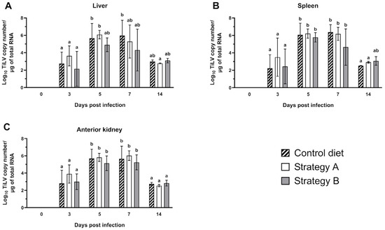 The levels of Tilapia lake virus (TiLV) RNA in the (A) liver, (B) spleen, and (C) anterior kidney of the fish fed the control diet or the feed supplemented with additives using strategy A or B at 0, 3, 5, 7, and 14 days post-infection. The data from five fish are presented as the mean ± standard deviation. Different alphabets indicate statistical differences (p < 0.05) between groups according to Tukey’s multiple comparison tests.