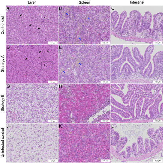 Histopathological changes at 7 days post-infection in the liver, spleen, and intestines of red hybrid tilapia coinfected with Tilapia lake virus and Aeromonas hydrophila: comparison between the groups that received the control diet (A–C) or additive-supplemented feed (D–I) and the uninfected control group (J–L). Syncytial hepatocytes (black arrows), the presence of intracytoplasmic inclusion bodies in the liver (arrowheads, inset), the severe depletion of red blood cells, and the distinct proliferation of melanomacrophage centres in the spleen (blue arrows) are denoted.