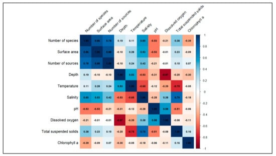 According to the analysed data, a multivariate approach displaying the correlation matrix of species and environmental parameters (Figure 2), and the Principal Component Analysis (PCA) biplot (Figure 3) was conducted. In Figure 2, the correlation matrix provides a visual summary of the relationships between the number of species and the other considered variables for the coastal lagoons of Albania. In particular, the matrix shows a positive correlation between the number of species and surface area, between the surface area and number of sources, and between the number of species and number of sources. Also, a moderated correlation between the number of species and salinity is displayed.