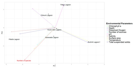 In Figure 3, the PCA biplot better explains the correlations between the number of species and other variables in the coastal lagoons of Albania. In particular, this figure displays more clearly the strong correlation between the number of species, surface area, and number of studies. These results suggest that larger lagoons tend to support higher species richness, as well as to represent preferred study areas for biodiversity studies [91].
