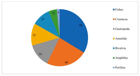 For the gap analysis, only the aquatic animal species reported in all the Albanian coastal lagoons were considered. The main aquatic animal taxonomic groups characterising the coastal lagoon ecosystems of Albania are Amphibia, Annelida, Bivalvia, Crustacea, Fishes, Gastropoda, and Porifera. The composition and abundance of these taxonomic groups in the coastal lagoons of Albania are reported in Figure 4.