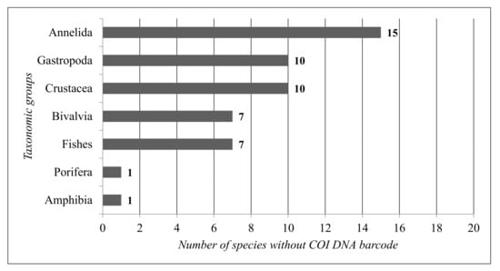Based on the results concerning the COI DNA barcode gap analysis of the analysed species, Figure 8 synthesises the comparison between total aquatic animal species per taxonomic group and the number of species without a COI barcode in the DNA barcode reference libraries.