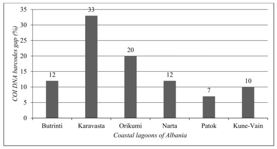 In Figure 7, the COI gap was reported for each coastal lagoon ecosystem. Karavasta Lagoon shows the largest gap in the COI DNA barcode (33%), followed by Orikumi Lagoon (20%). Patok Lagoon shows the lowest COI DNA barcode (7%).